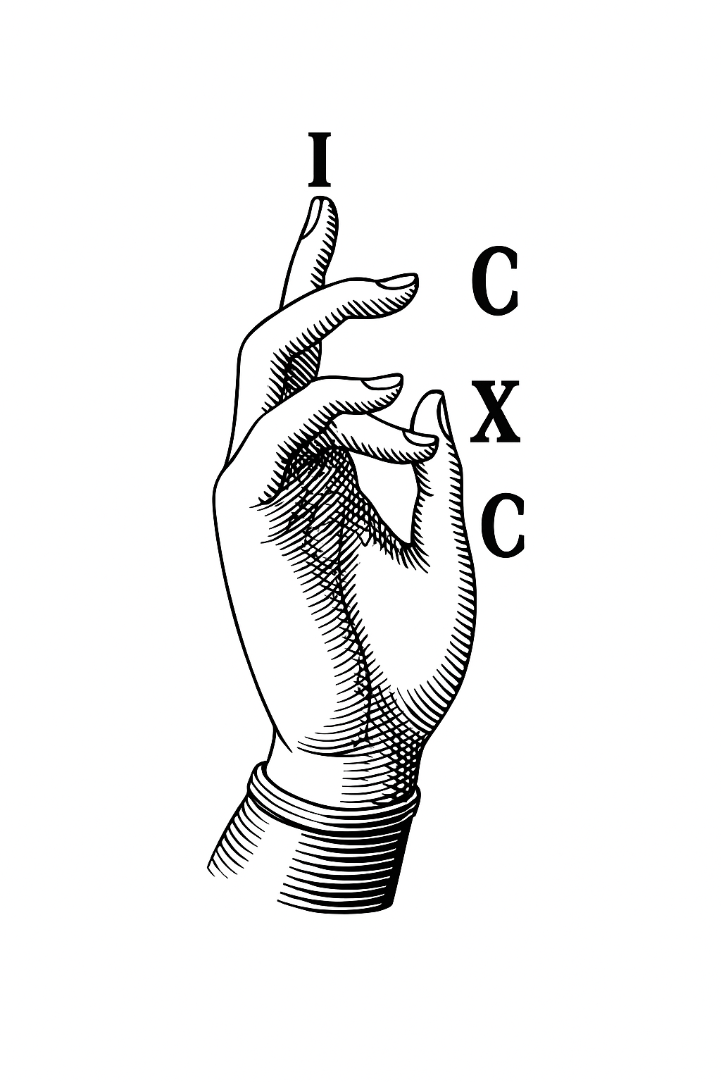 The index finger stands straight as I, the middle finger curves to form C, the ring finger crosses the thumb for X, and the little finger bends once more for the final C.